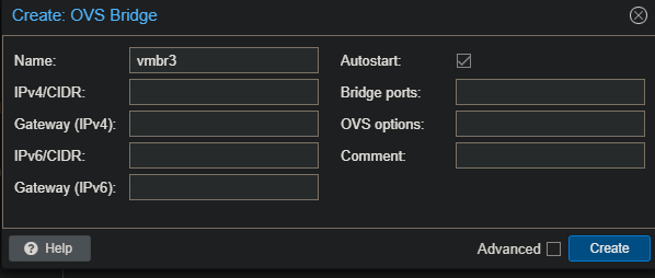 Once the OVS package is installed, create the vmbr3 bridge. In Proxmox, navigate to System -> Network and add a new OVS bridge. Name it ‘vmbr3’ and leave the remaining fields at their default values.