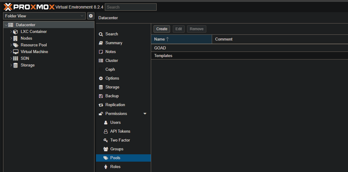 As per the Proxmox documentation, a resource pool is a collection of virtual machines, containers, and storage devices. It’s a useful feature for managing permissions, especially when certain users need controlled access to specific resources. Instead of managing permissions for each resource separately, you can apply a single permission to a group of elements. In the GOAD setup, we’ll primarily use pools to organize the environment. To create a new pool, go to the datacenter, then navigate to Permissions, and click on Pools. Create two pools: GOAD and Templates.