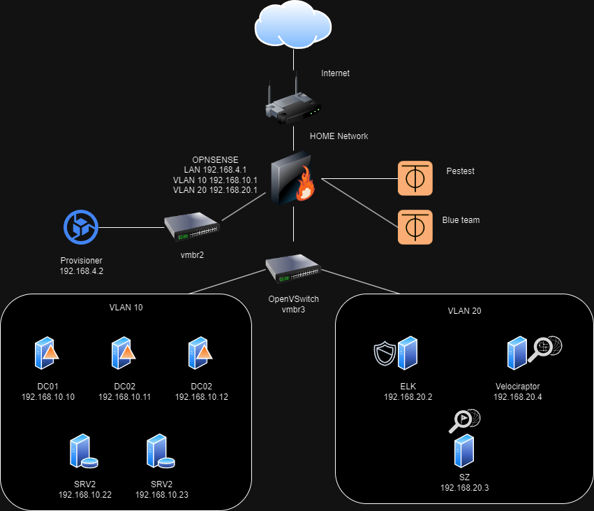 - An extra VLAN 20: Used to isolate the blue team infrastructure for enhanced segmentation.