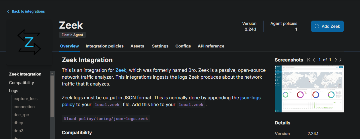 Zeek does not store logs in JSON by default. It is crucial to change this because, without the logs in JSON format, the Elastic Agent will not be able to collect the Zeek logs. You can modify this configuration by adding the following line to the file /opt/zeek/share/zeek/site/local.zeek: