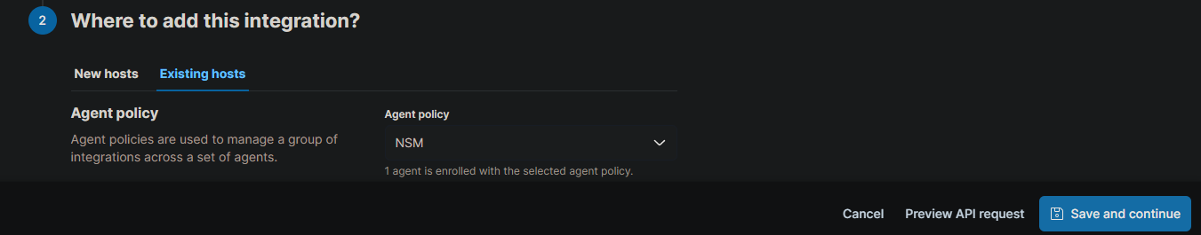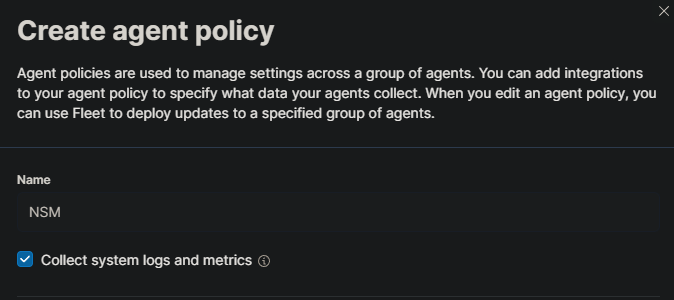 In our SZ machine, we’ve installed Zeek and Suricata. It’s time to gather valuable information. To do this, let’s create a new Agent policy in Elastic. Go to Elastic -> Manage -> Fleet -> Agent Policies and click on “Create agent policy”. Name the policy “NSM” (Network Security Monitoring) there.