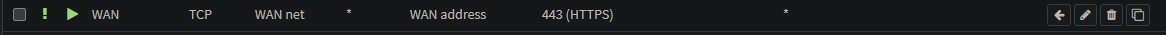 Finally, go to Firewall -> Rules -> WAN and create a rule that allows the traffic from your WAN net to your WAN address to port 443/TCP.