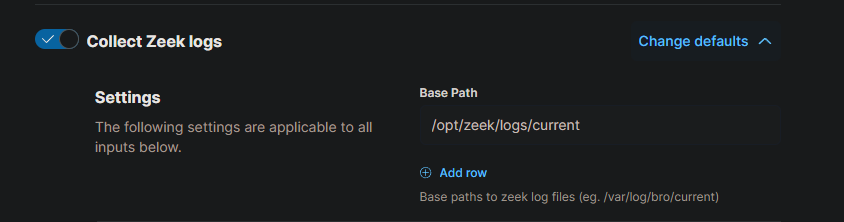 We can change the defaults of this integration. In this case, change the base directory for Zeek logs. There are two paths that we don’t need. Change it to look like this: